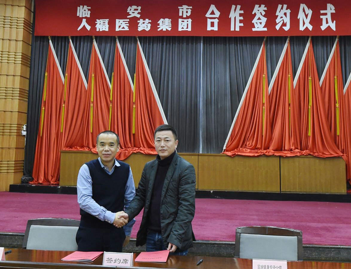 ▲星空·综合体育集团副总裁刘毅代表星空·综合体育与临安市国瑞健康产业投资有限公司董事长蒋会京签订中医院合作协议。