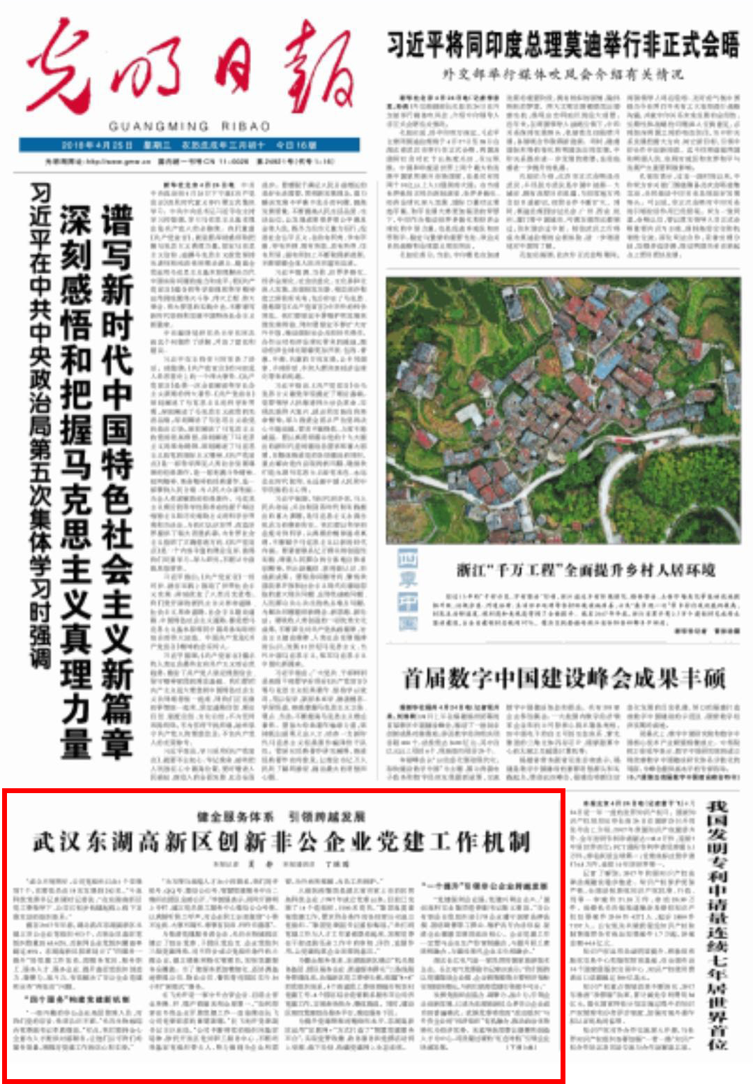 发挥党组织创造力、凝聚力、战斗力,引领企业创新发展,已成为东湖高新区众多非公企业成功的普遍模式。4月25日,《光明日报》就“武汉东湖高新区创新非公企业党建工作机制”进行了头版重点报道,引发关注和思考。